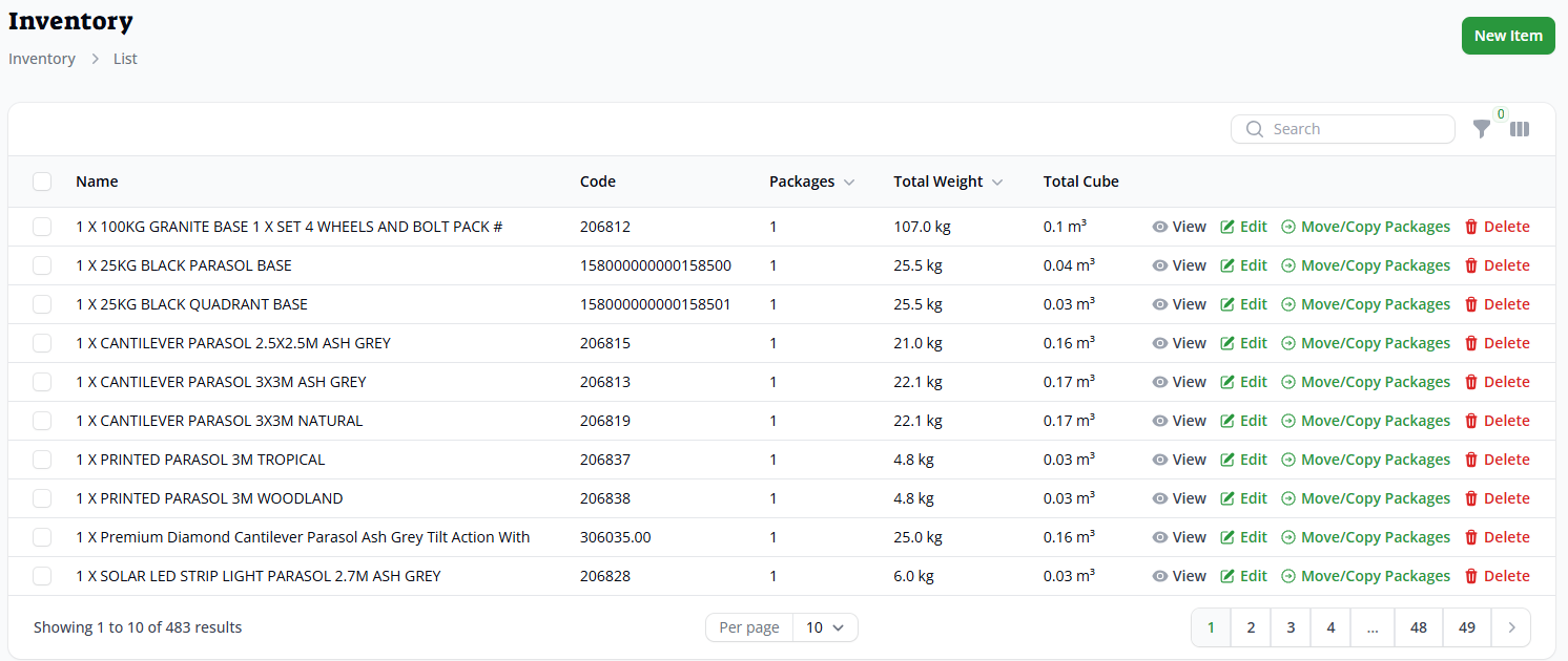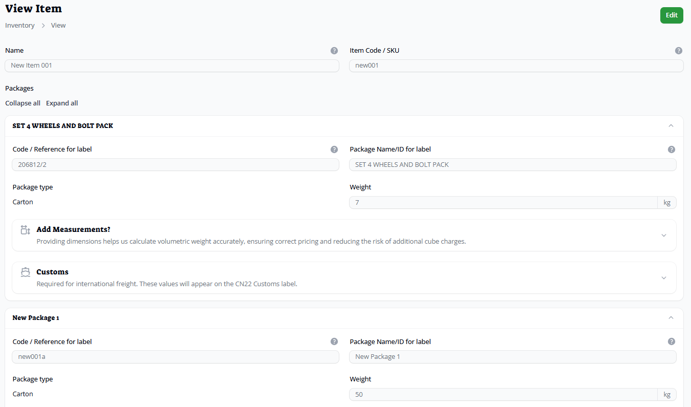 Existing inventory items can be edited by choosing the edit option from either the list view, or from viewing the item itself. Packages can be amended, added or removed (by clicking the bin icon against the package to be removed).