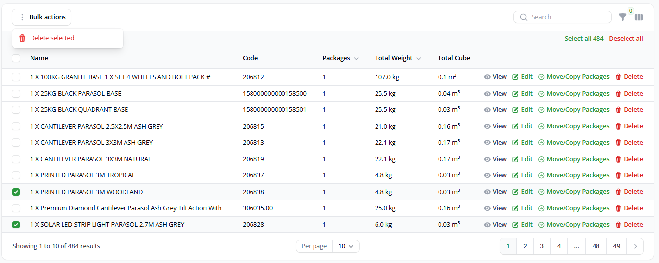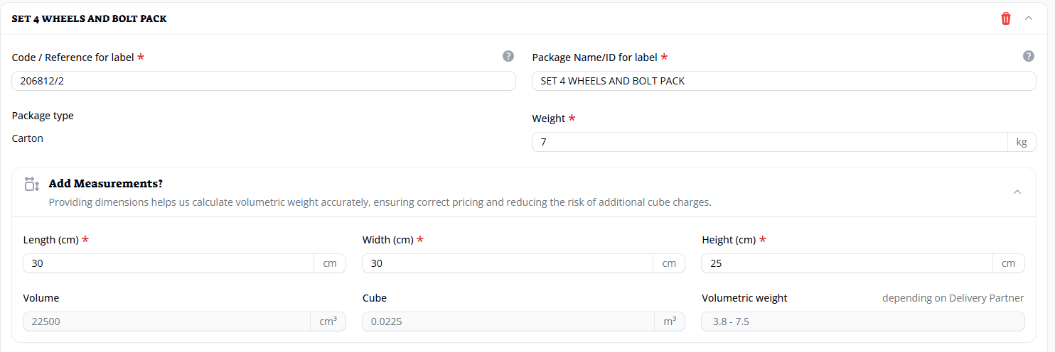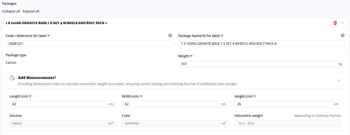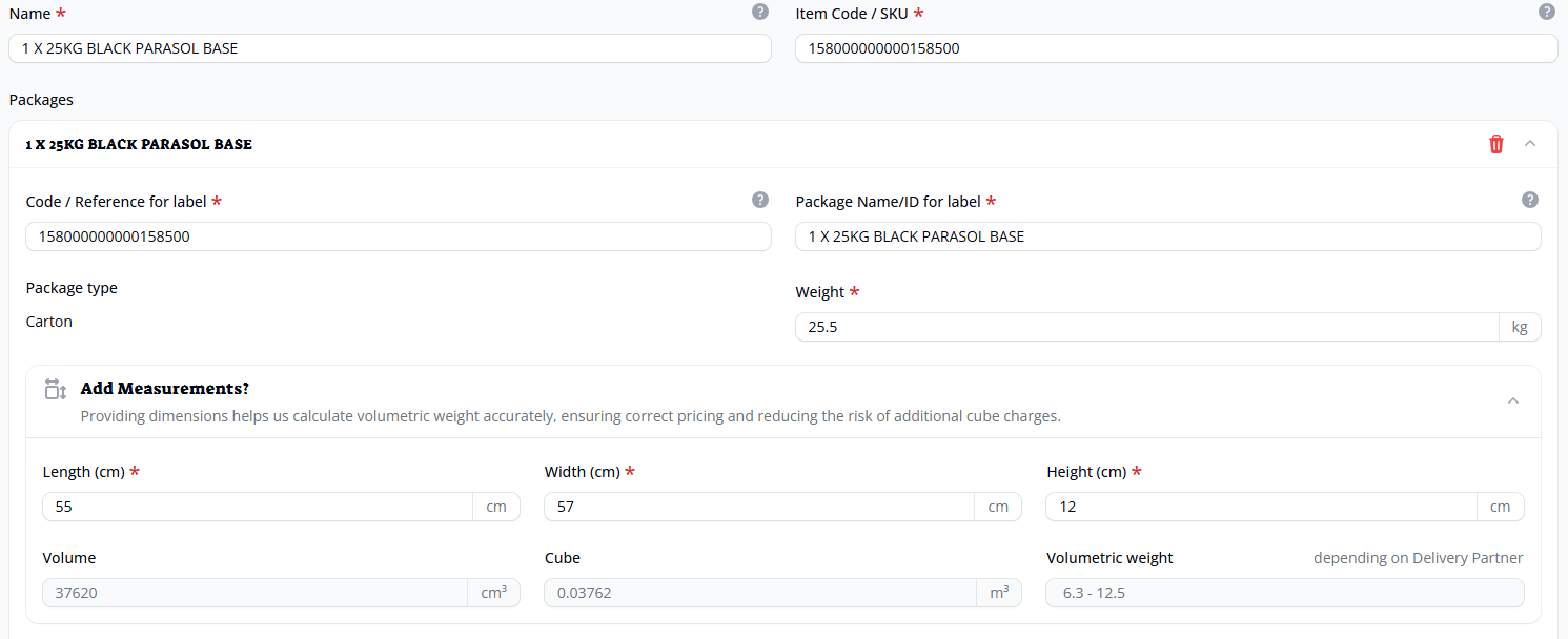 When items or item sets have been selected via either manual consignment creation, or via CSV upload, the individual package details are displayed within the consignment details and on the labels.