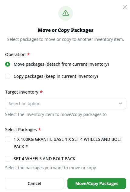 To move or copy a package click on Move/Copy Packages against the one you wish to action. Click either the move option or the copy option, choose the target inventory & select which package you wish to use. Finally, click the move/copy packages button.