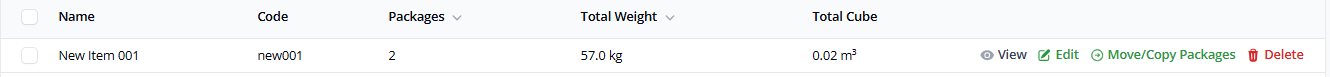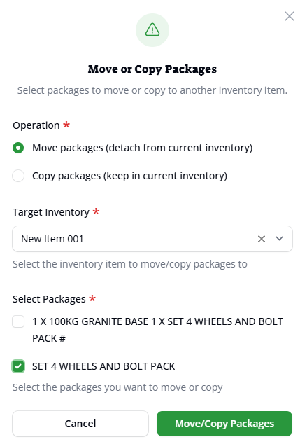 Individual packages can also be copied (leaves the original in place) or moved (removes the original) between items from the inventory list screen. This is particularly useful where 1 product has been updated to include features from another one. If items need to be moved/copied into a new one, then please create and save the new item (as above as a single package item) first
